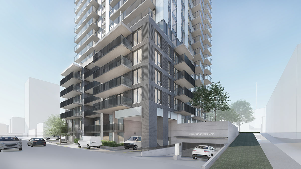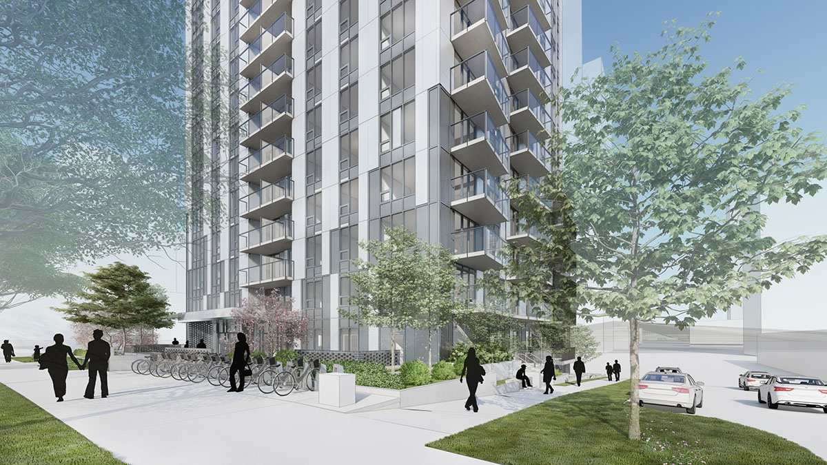 Its approach to the ground plane and massing allow it to fit within the established context of mid- and high-rise apartment buildings and the treed boulevards of the surrounding streets.