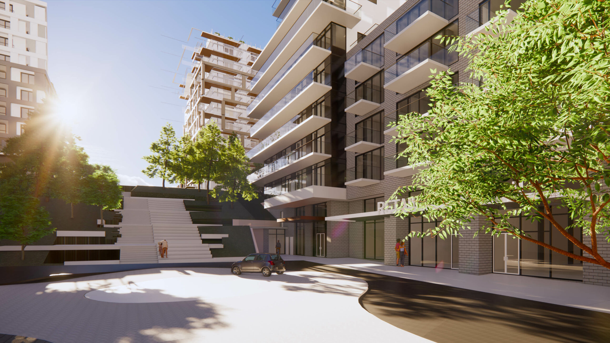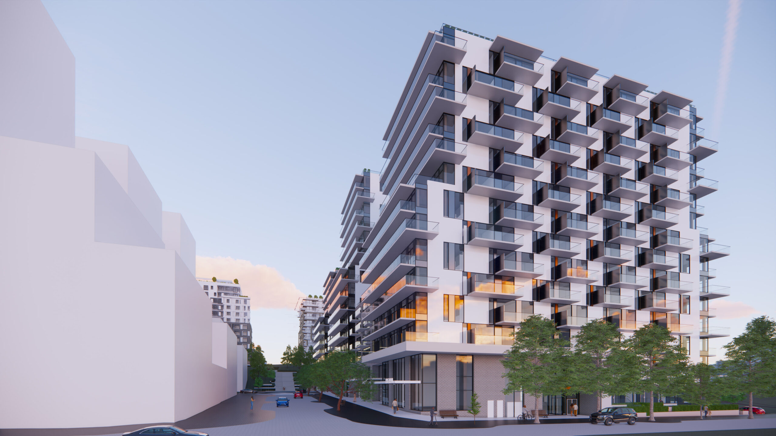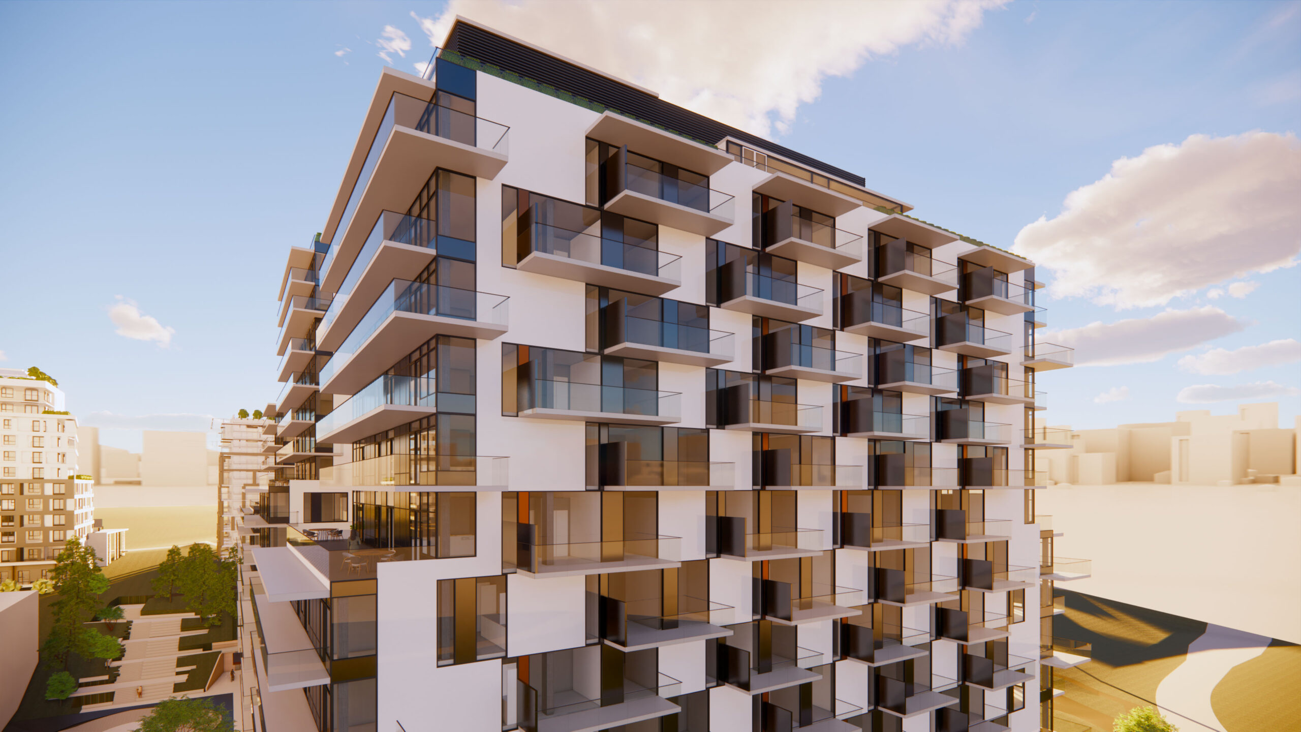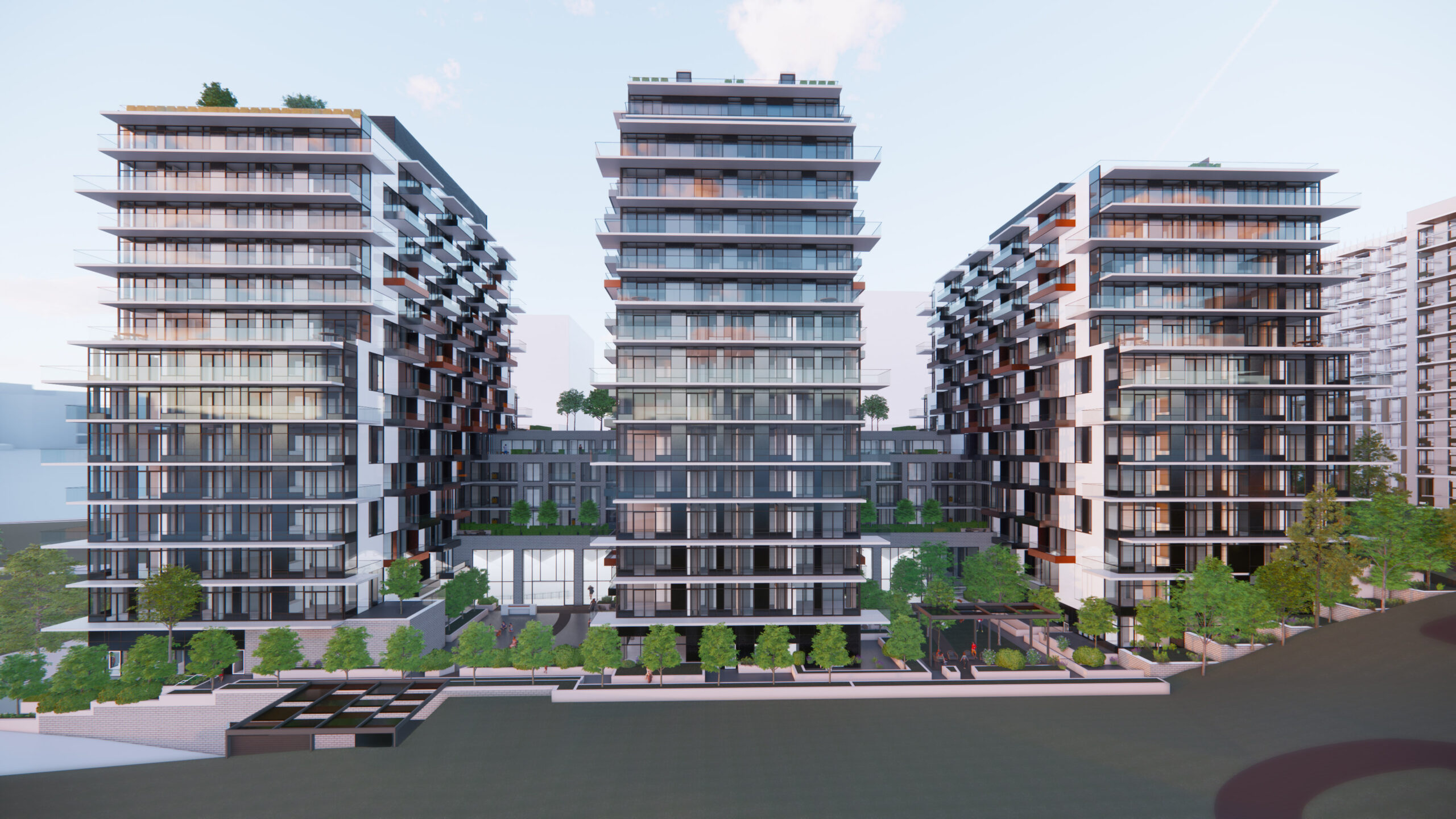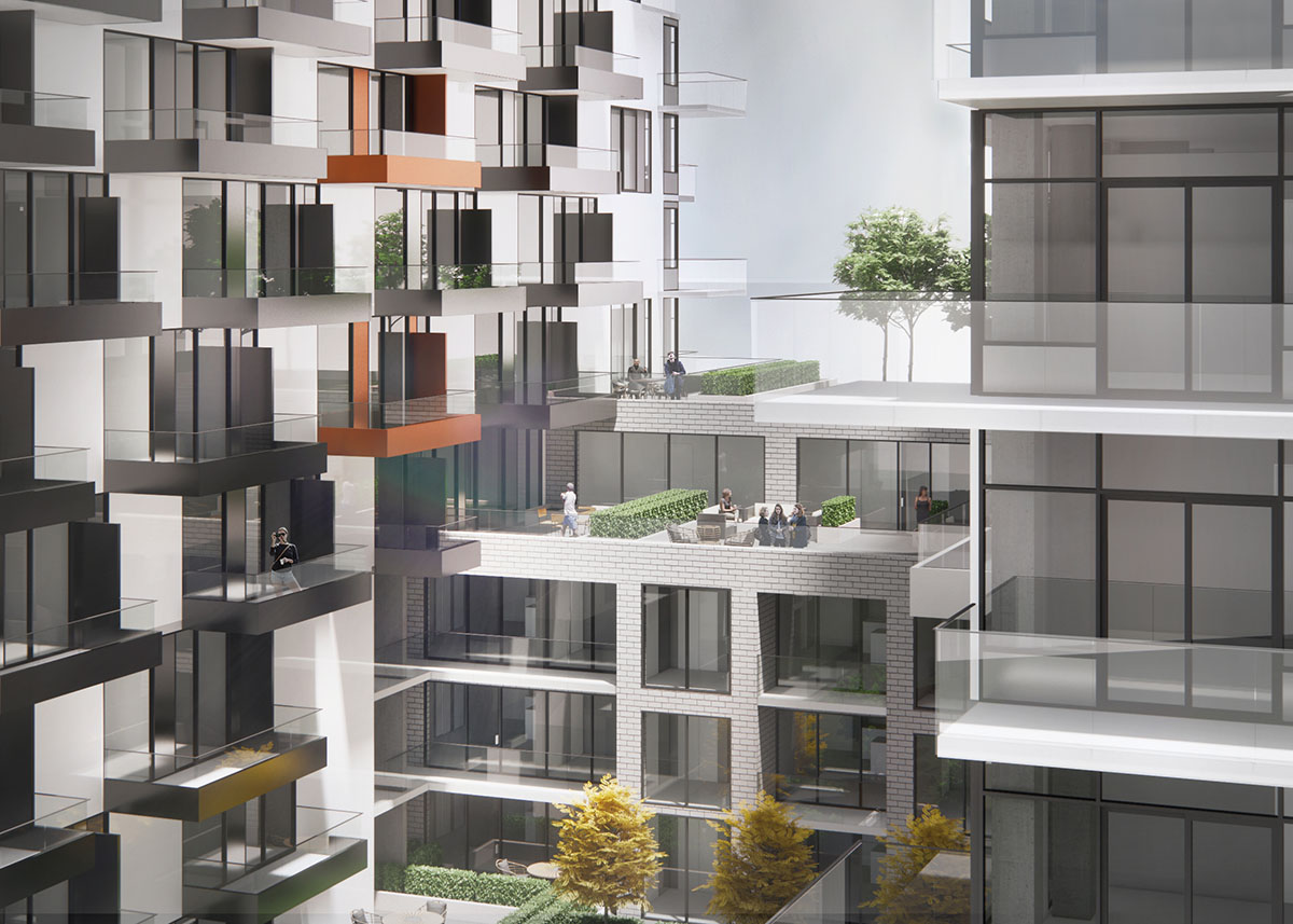 Along the south edge, and outdoor promenade links the two courtyards to future public pathways, creating a gentle transition between public and private space. The upper floors of the podium and towers are set back to create terraces, softening the form and allowing more light into corner conditions. On the east and west facades, balconies are arranged in a playful ‘checkerboard’ pattern to create variation and depth, helping to break down the long planes into smaller scale elements.