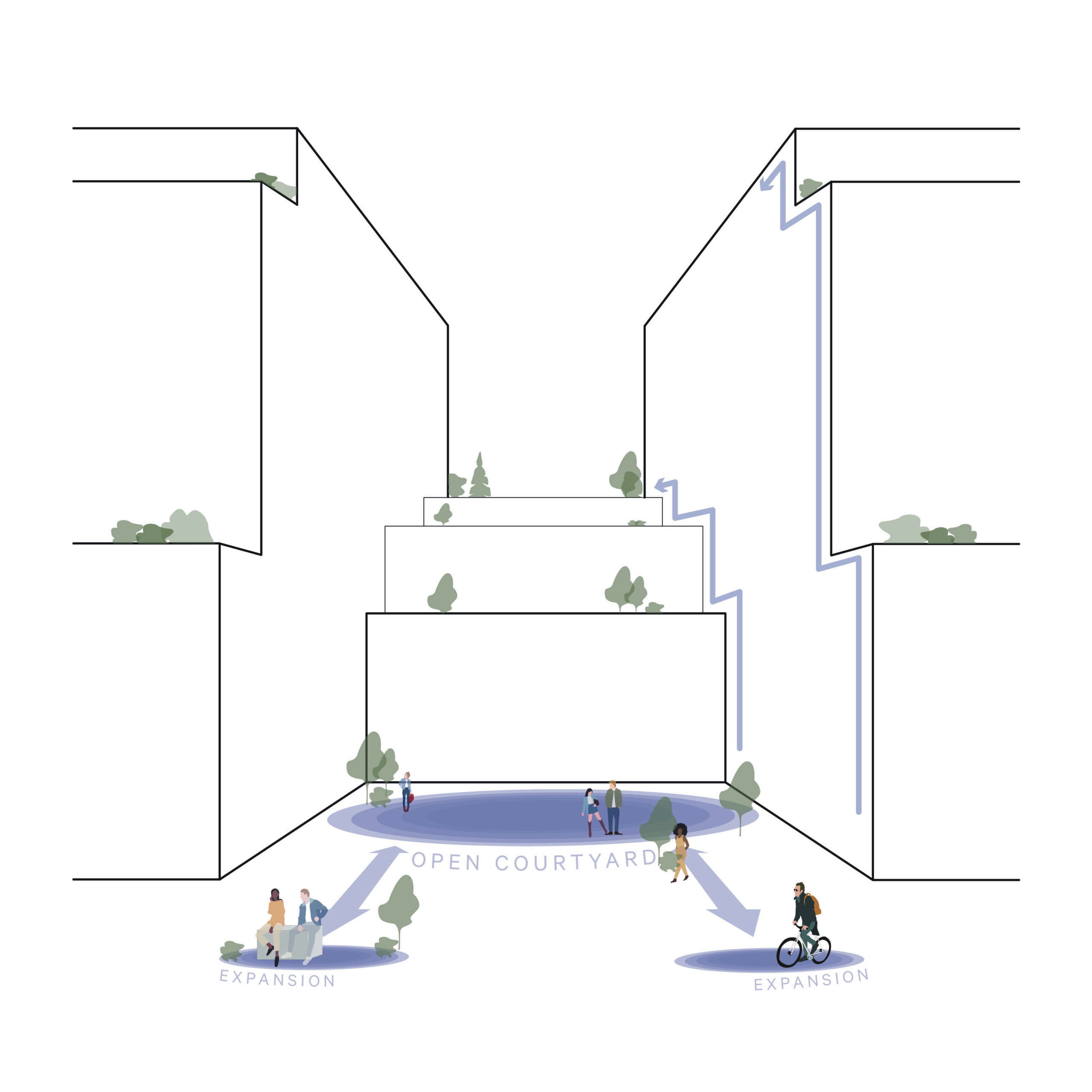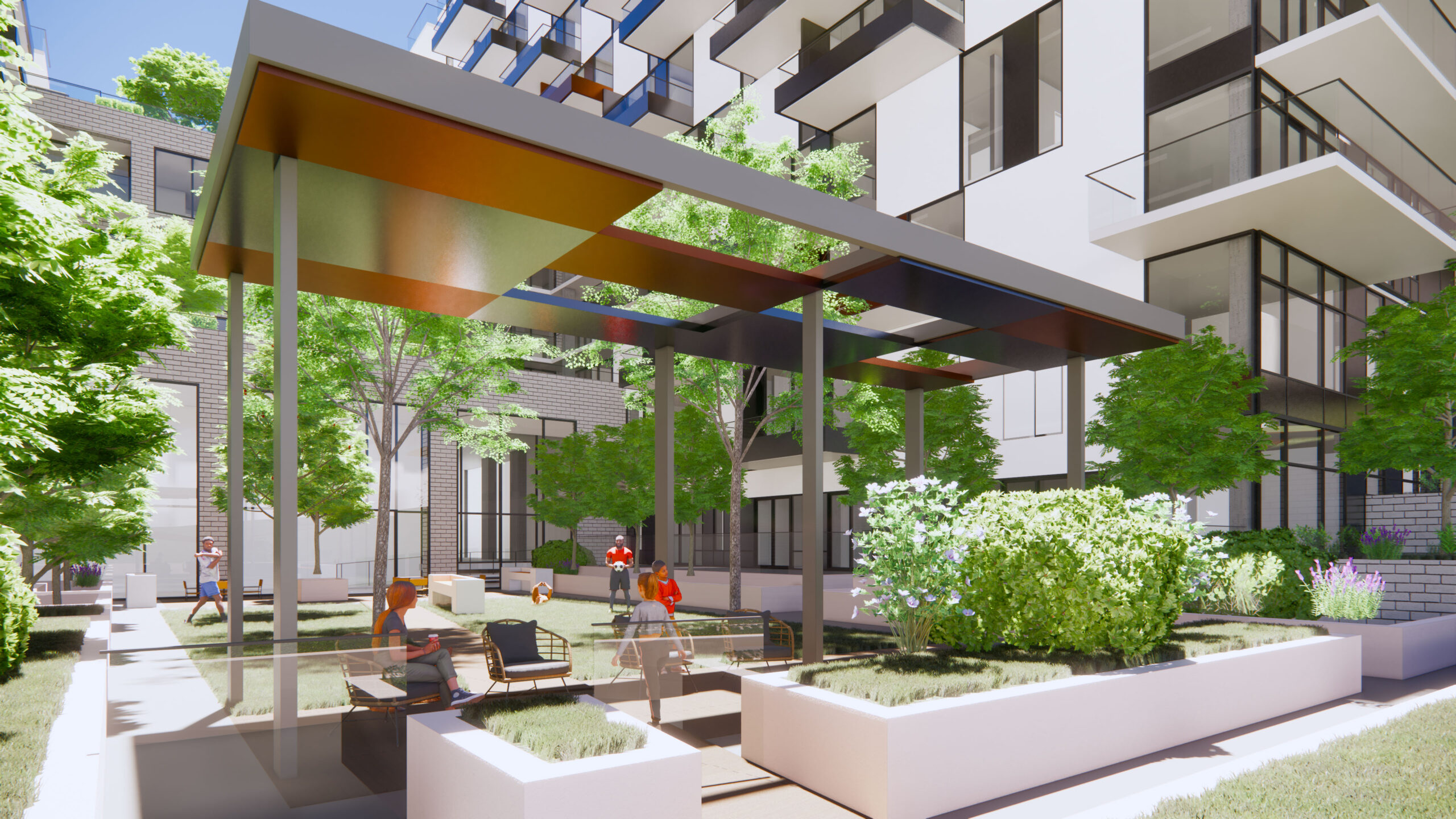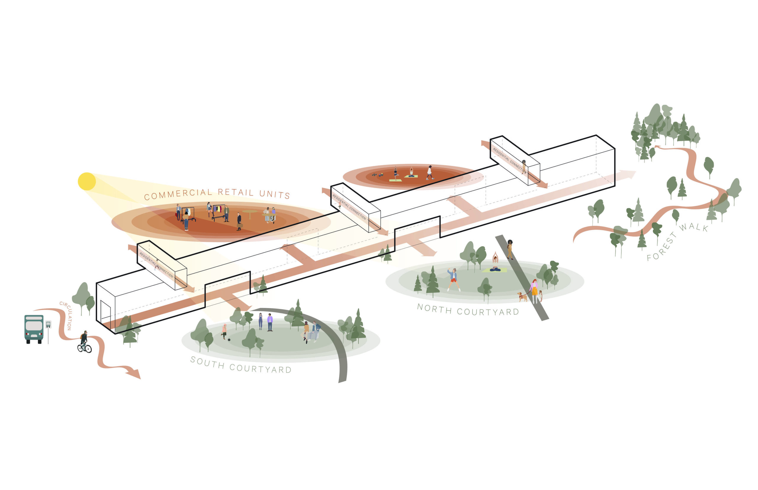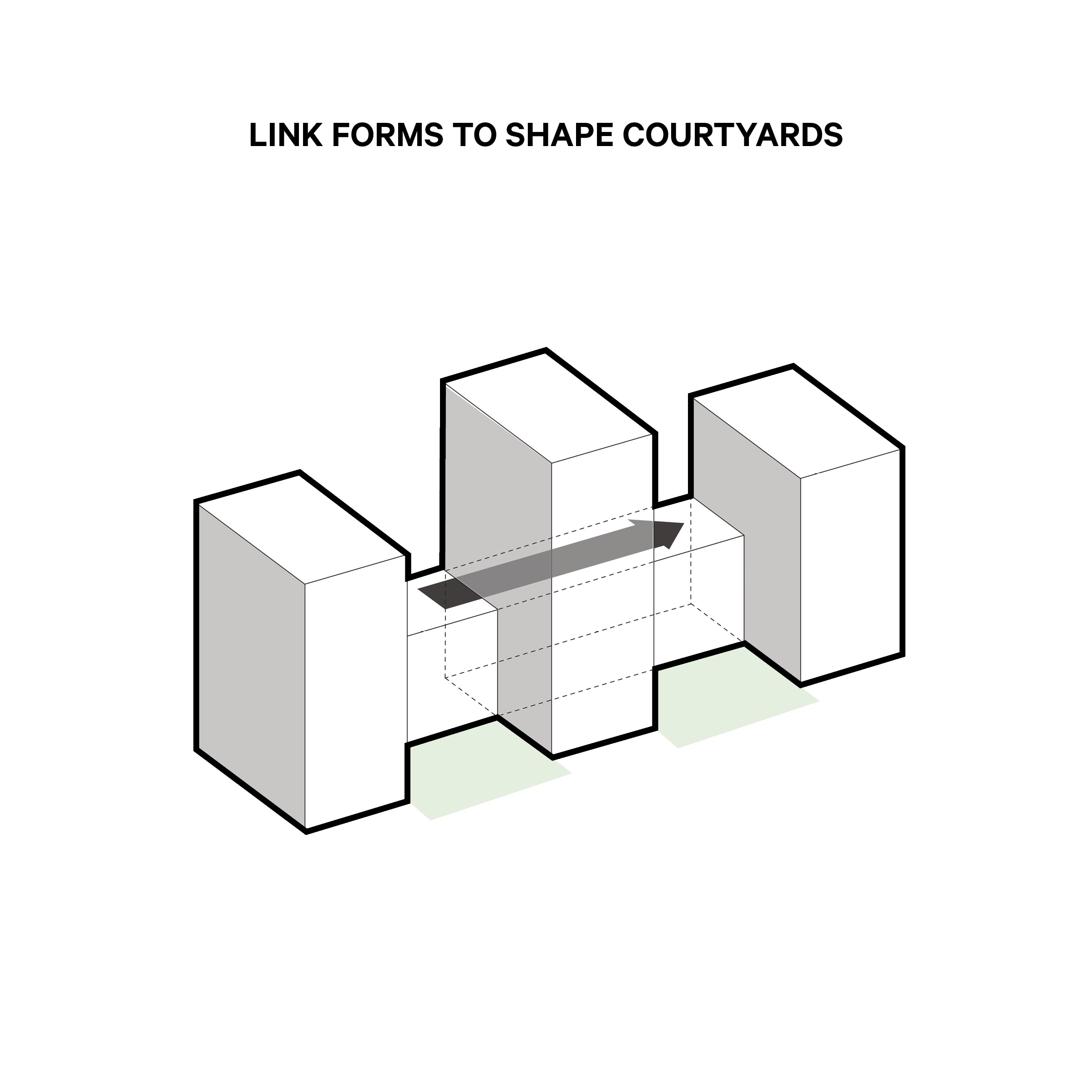 Along the south edge, and outdoor promenade links the two courtyards to future public pathways, creating a gentle transition between public and private space. The upper floors of the podium and towers are set back to create terraces, softening the form and allowing more light into corner conditions. On the east and west facades, balconies are arranged in a playful ‘checkerboard’ pattern to create variation and depth, helping to break down the long planes into smaller scale elements.