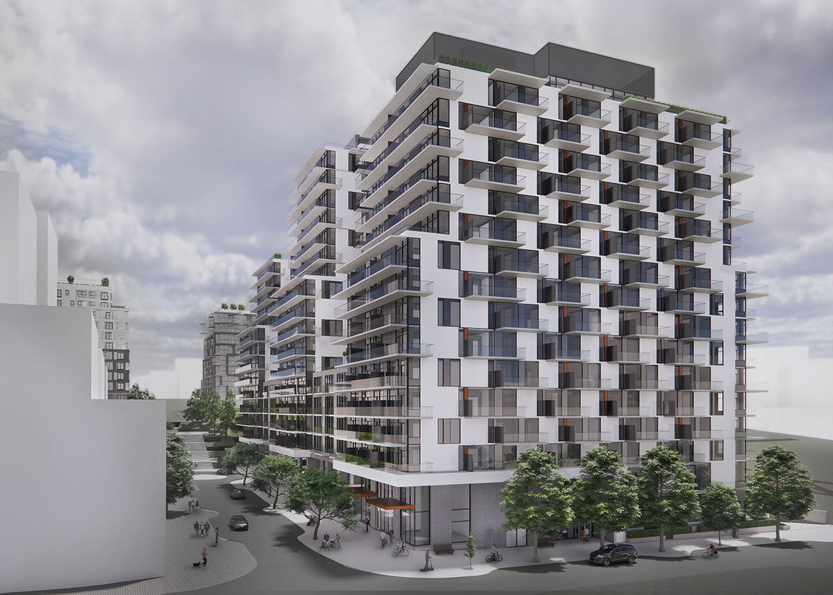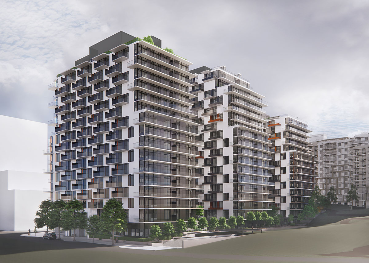 Located in the new Burnaby Lake Village Master Plan near Sperling SkyTrain station, this mixed-use project integrates significant retail frontage along the street with just over 500 residential units (20% of which are adaptable). The form is split into three distinct towers connected by a podium, allowing for enhanced permeability with the creation of two south-facing courtyards. At the ground level, the prominent connection corridor – which links the three residential lobbies and provides access to indoor amenities and courtyards – is envisioned as a meeting place where all occupants can cross paths and socialize.